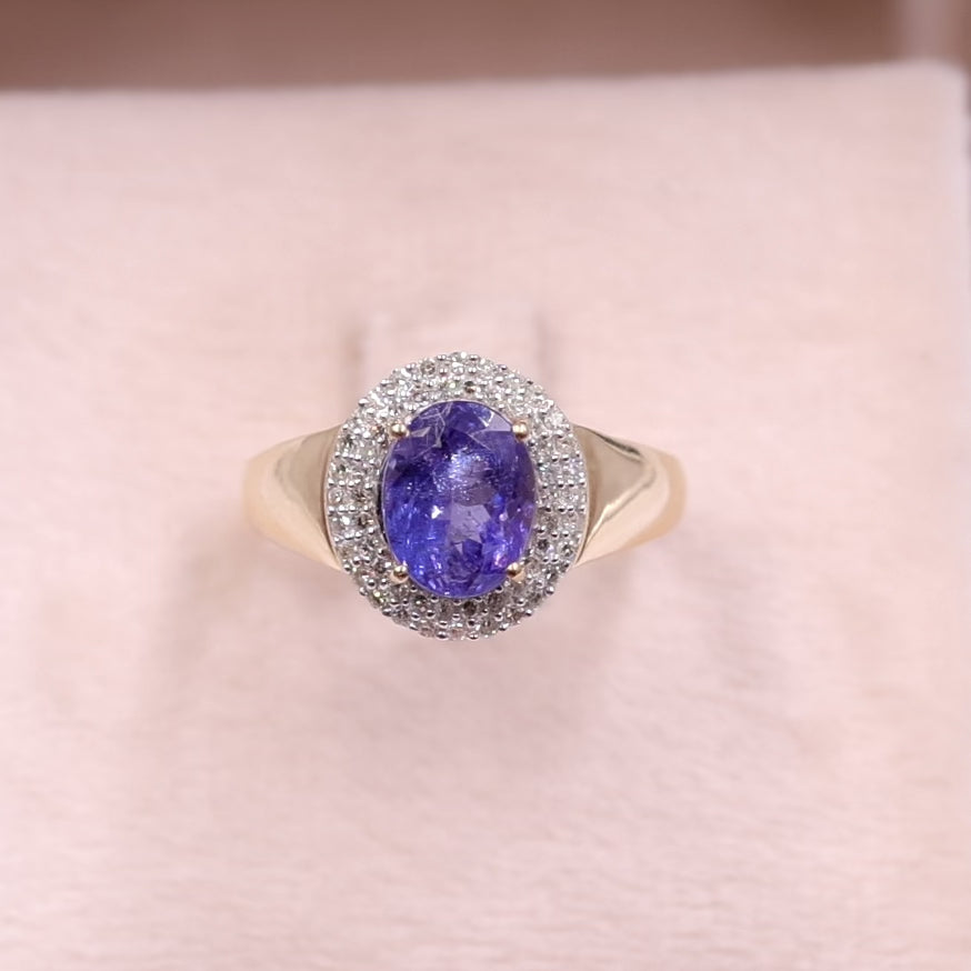 Anel vintage em ouro 14k com design de margarida, tanzanita (2,10 ct) e diamantes (0,30 ct no total), década de 80.