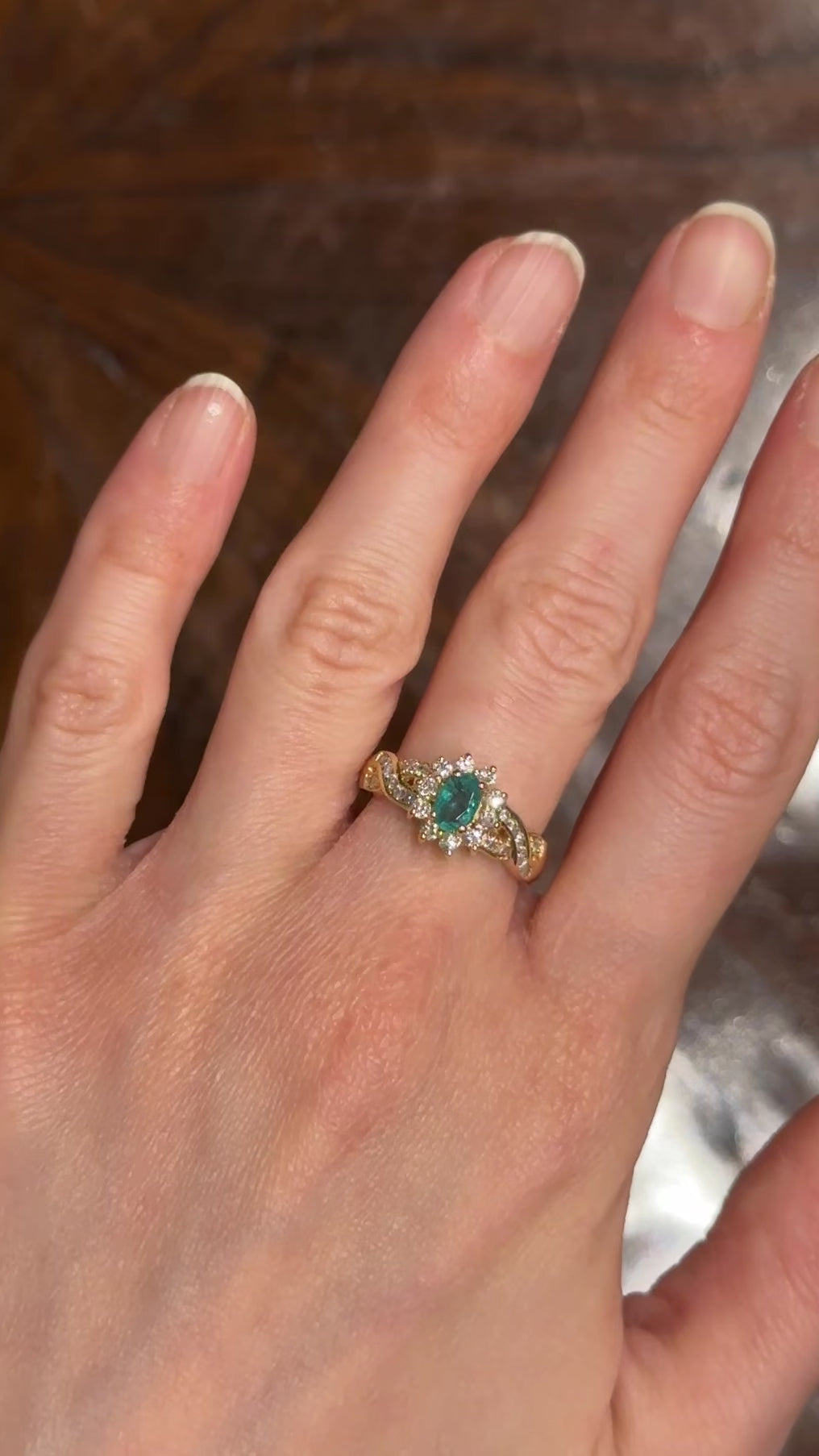 Anel vintage margarida em ouro amarelo 14K com esmeralda (aprox. 0.40 ct) e diamantes lapidação brilhante (aprox. 0.60 ctw), anos 70/80